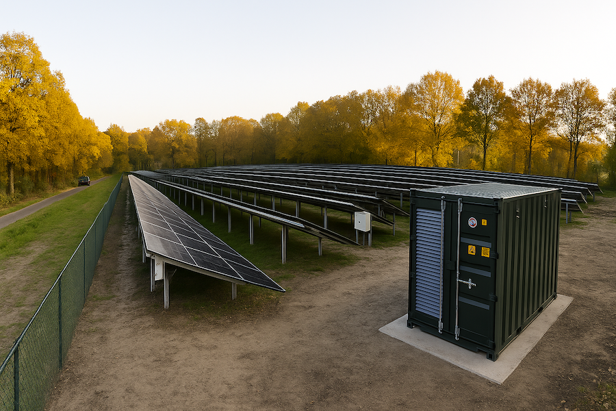 Naast de panelen is ook het energieopslagsysteem (EOS) aanwezig. Daarmee kunnen we de opgewekte zonnestroom tijdelijk opslaan en beter afstemmen op momenten dat er meer vraag naar energie is. Met deze megabatterij kunnen we genoeg energie opslaan om 80.000 kopjes koffie te zetten met zonnestroom, of 2.000 wasmachines te laten draaien op schone energie. Het zonnepark en het opslagsysteem delen dezelfde netaansluiting. Een slimme en duurzame stap richting een toekomstbestendig energiesysteem.